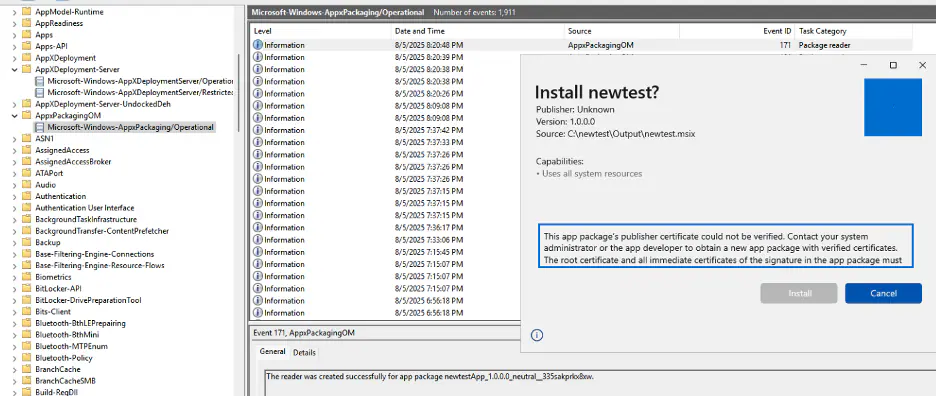 On the detection side, attention has shifted to in-depth Windows event log analysis. Key log sources, such as AppXDeploymentServer, AppXPackaging, and process creation events, can reveal early signs of unsigned, developer-signed, or full-trust package installations and script executions from virtualized directories.