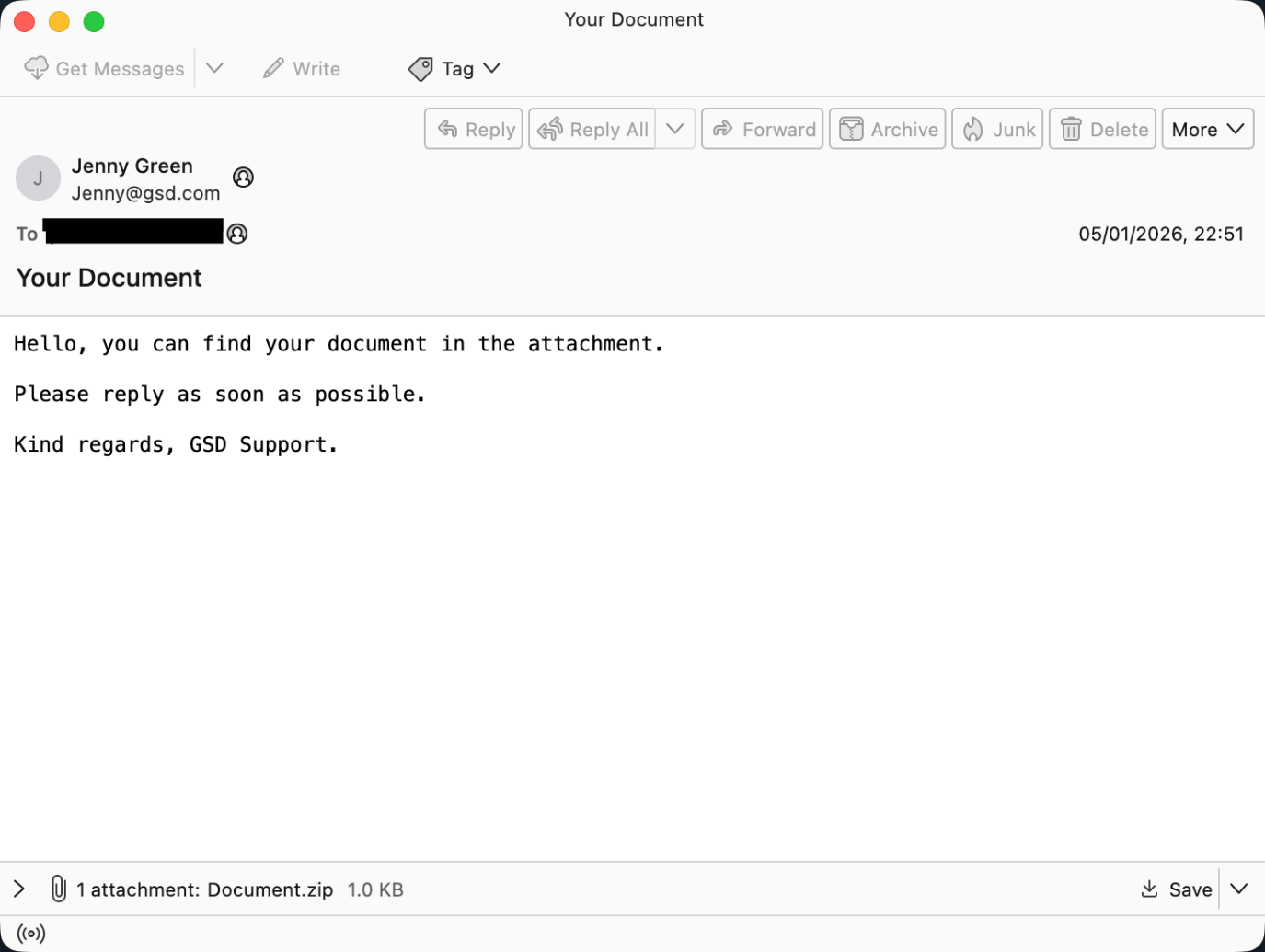 This campaign, active throughout 2024 and 2025, starts with a plain email. The subject line usually reads “Your Document,” a phrase designed to make you curious or worried enough to click. Inside is an attachment or a Zip folder, often named Document.doc.lnk. Hackers use a double extension here because Windows often hides the last part of a file name. To a normal person, it just looks like Document.doc, but further probing revealed it is actually a Windows Shortcut file (.lnk).