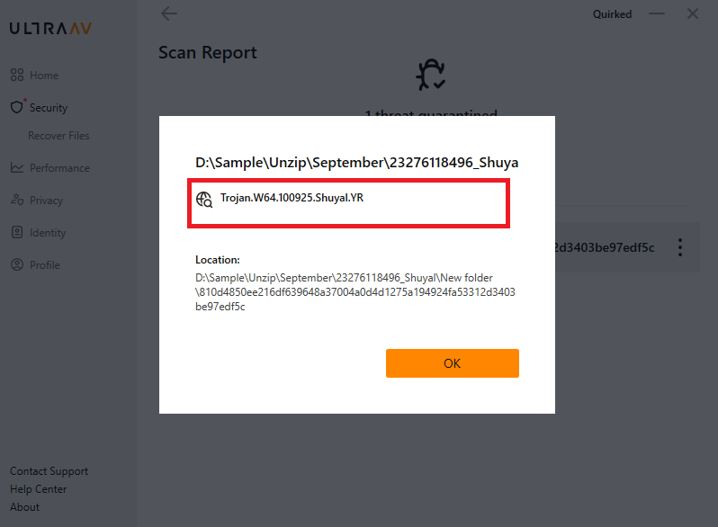 The malware sample analyzed, compiled as a 64-bit C++ executable (SHA-256: 8bbeafcc91a43936ae8a91de31795842cd93d2d8be3f72ce5c6ed27a08cdc092), has been detected under the name Trojan.W64.100925.Shuyal.YR by UltraAV antivirus.
