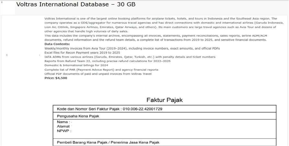 The CYFIRMA Research team has observed that Voltras International, a prominent online booking platform and GDS aggregator based in Indonesia, has allegedly been compromised. A threat actor is currently selling a 30GB database claimed to be the company’s internal archive for $4,500. Voltras International serves as a major hub for numerous travel agencies in Southeast Asia, maintaining direct connections with airlines such as Garuda Indonesia, Emirates, and Singapore Airlines. The breach purportedly affects the company’s internal operations, specifically involving transaction records and agency financial details.