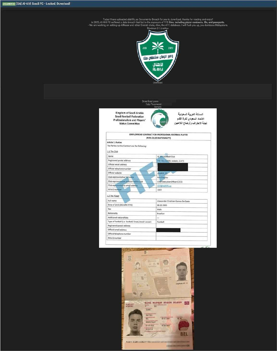 The CYFIRMA Research team observed that Al-Ahli Saudi Football Club (Al-Ahli FC), a professional multi-sport club based in Jeddah and a prominent member of the Saudi Pro League, has allegedly suffered a significant data breach. The incident involves the unauthorized exfiltration of internal documents, which were subsequently leaked on a popular dark web forum. The party responsible for the leak claims to have obtained over 111 files from the club’s infrastructure and has signaled intentions to target other high-profile Middle Eastern football organizations and the Asian Football Confederation (AFC) database.