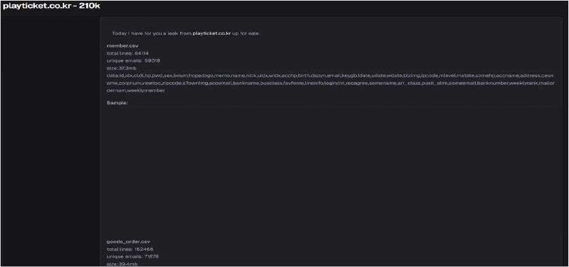 The CYFIRMA Research team has identified that Play Ticket, a South Korean online ticketing and reservation platform, has allegedly been compromised, resulting in the exposure of significant user and order data. A threat actor on a cybercrime forum has listed a database for sale, claiming to contain approximately 210,000 records linked to the domain playticket.co.kr. The breach reportedly involves two separate files—one containing member details and another containing order history—offered for a low price of $150.