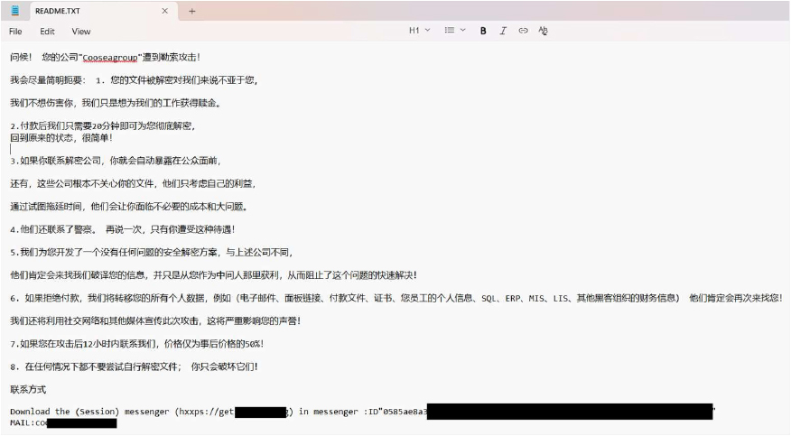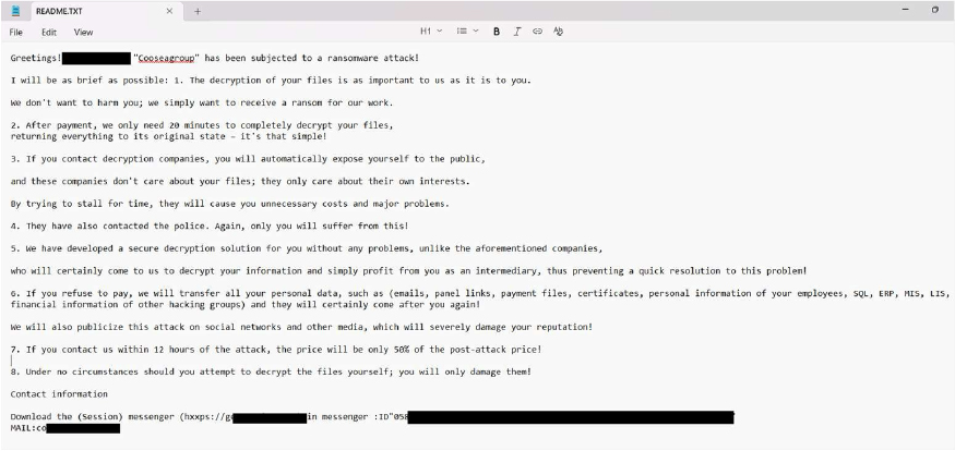 CYFIRMA’s assessment identifies COOSEAGROUP as a ransomware strain that encrypts victim data and appends a unique victim identifier followed by the “.Cooseagroup” extension to affected files, after which it generates a Chinese- language ransom note titled “README.TXT” stating that file decryption requires payment. The ransom note explicitly threatens the disclosure of sensitive and confidential data, including communications, databases, certificates, financial records, and employee information, if payment is not made, and applies time- based pressure by offering a reduced ransom if the attackers are contacted within 12 hours. Victims are instructed to communicate via the Session messenger, indicating the use of anonymized communication channels, and are discouraged from seeking third-party assistance such as law enforcement or recovery services, with warnings that manual decryption attempts may permanently damage the encrypted files. The note also claims limited decryption capability following payment as proof of functionality. Based on documented behavior, COOSEAGROUP operates using a ransomware model that combines file encryption with explicit data-leak extortion and coercive negotiation tactics; removal of the malware prevents further encryption but does not restore affected files, no free decryptor is available, and recovery is only possible through restoration from secure backups, if available.