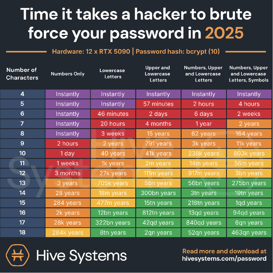 Gone are the days of a password with a 6-character minimum saved in a password protected spreadsheet and reused multiple times across different platforms. Depending on the length and complexity of your password it can take a hacker anywhere from seconds to 26 trillion years to crack your password (see chart below). The best course of action is to use a password manager to generate and store unique passwords.